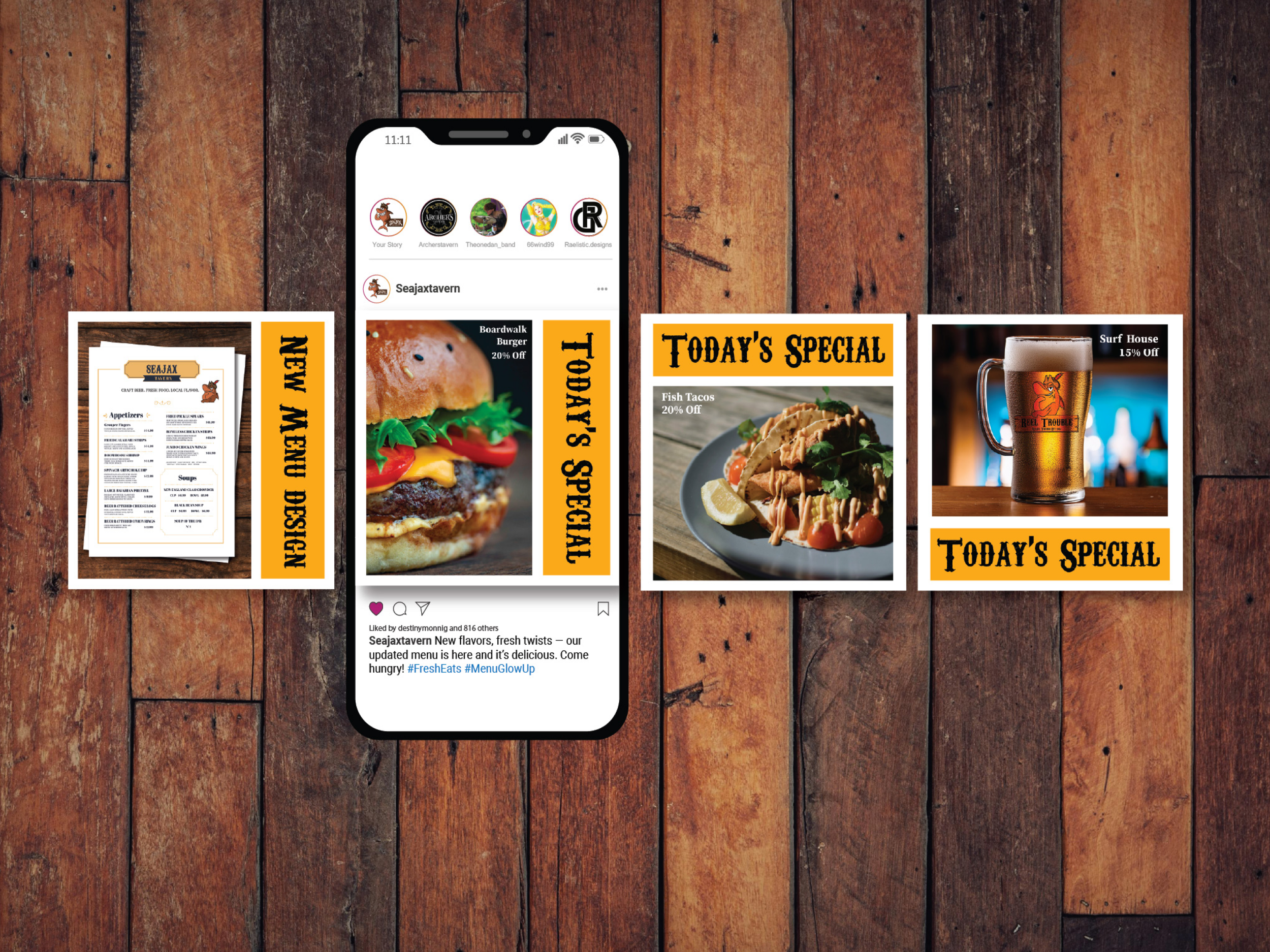 I developed the Sea Jax Tavern character as a way to create a strong, cohesive brand identity that reflects the personality and spirit of the tavern. The shark was chosen for its bold association with the sea. At the same time, the addition of the pirate hat adds a playful, adventurous element that aligns with the tavern’s welcoming and laid-back atmosphere. This character serves as more than just a logo; it establishes a visual identity that is both memorable and approachable. By incorporating this element, the brand becomes more engaging and distinctive, thereby creating a consistent experience across all touchpoints.
