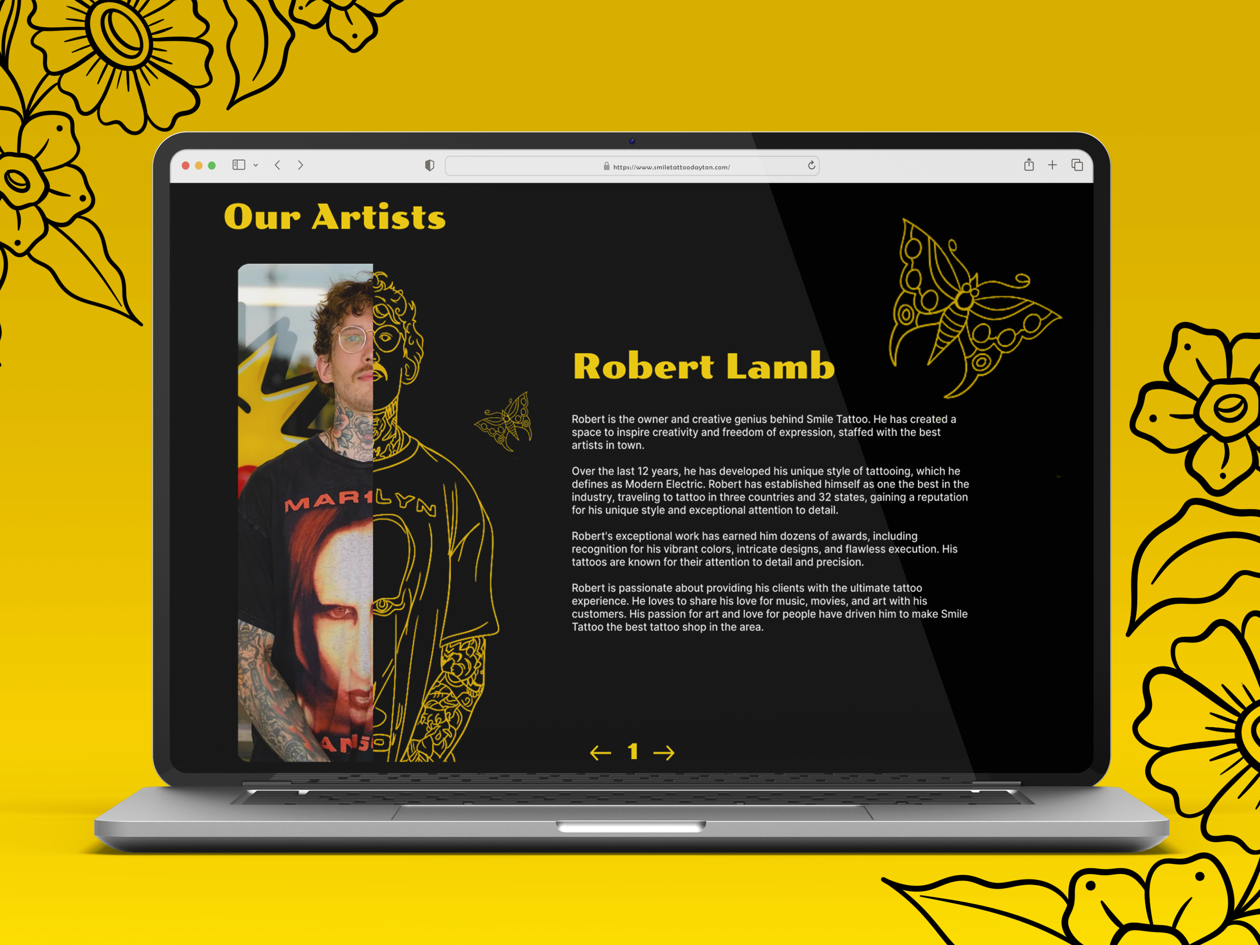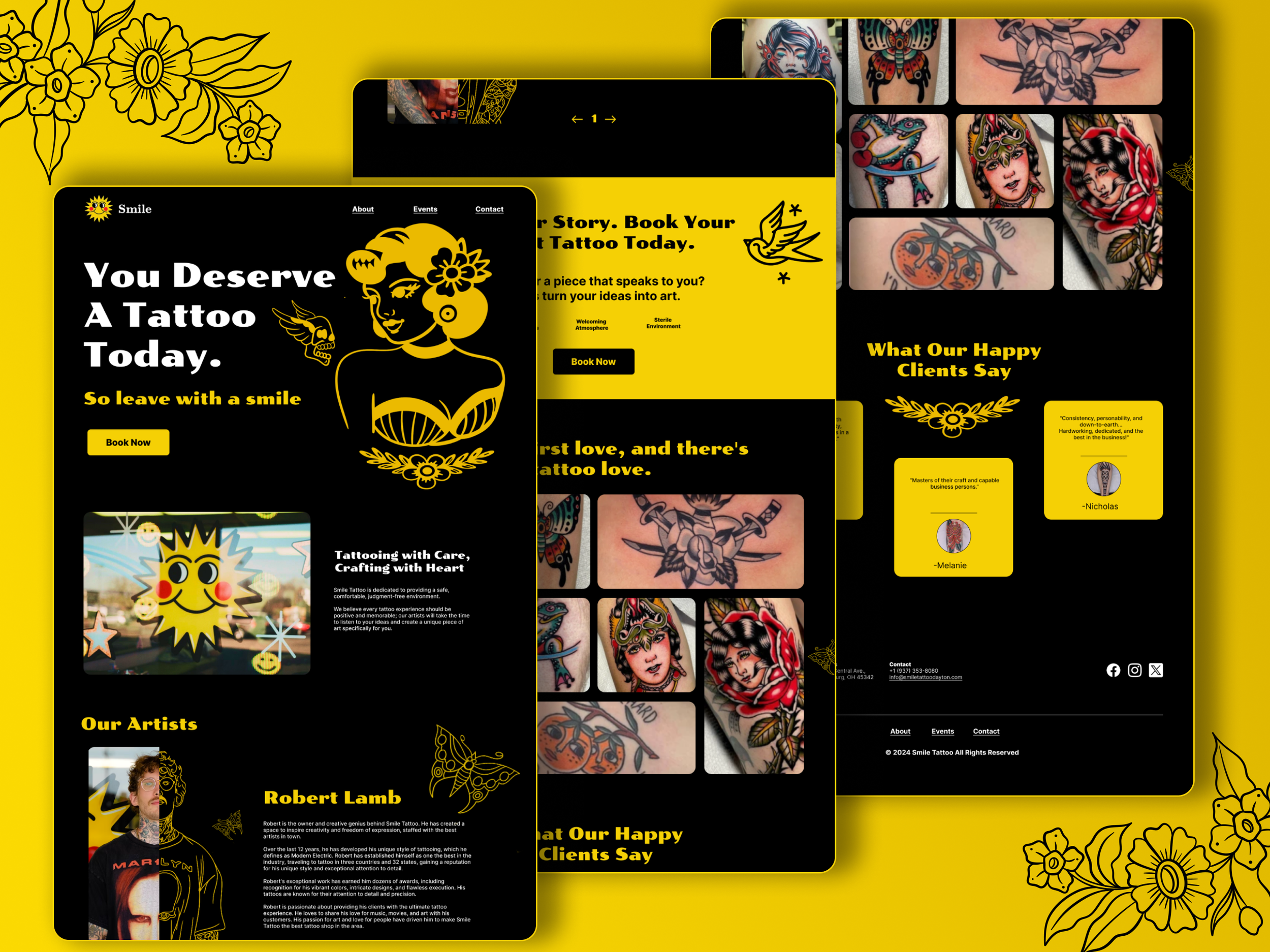 Smile Tattoo is Dayton's premier tattoo studio, specializing in bold American-Traditional tattoos with clean lines and solid shading, in vibrant color or black and gray. Their mission is to provide a welcoming, inclusive space for both first-timers and seasoned enthusiasts. The original website had an incohesive color palette and poor navigation. After researching customer feedback and exploring the artists' styles, I redesigned the site using a sleek dark palette with vibrant pops of white, black, and yellow for a cohesive flow. The new layout showcases key information upfront, such as pricing, portfolios, and services, with easy-to-find buttons for a streamlined experience.